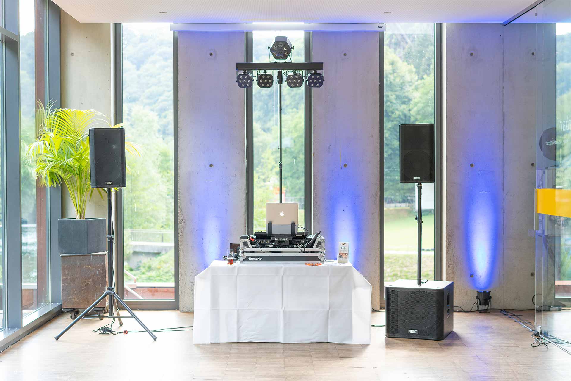 Tipp: Für das perfekte Licht-Ambiente empfehlen wir zusätzlich zum DJ-Paket Elegance unsere LED-Floorspots, welche durch indirekte farbige Beleuchtung Ihre Location in Szene setzen.