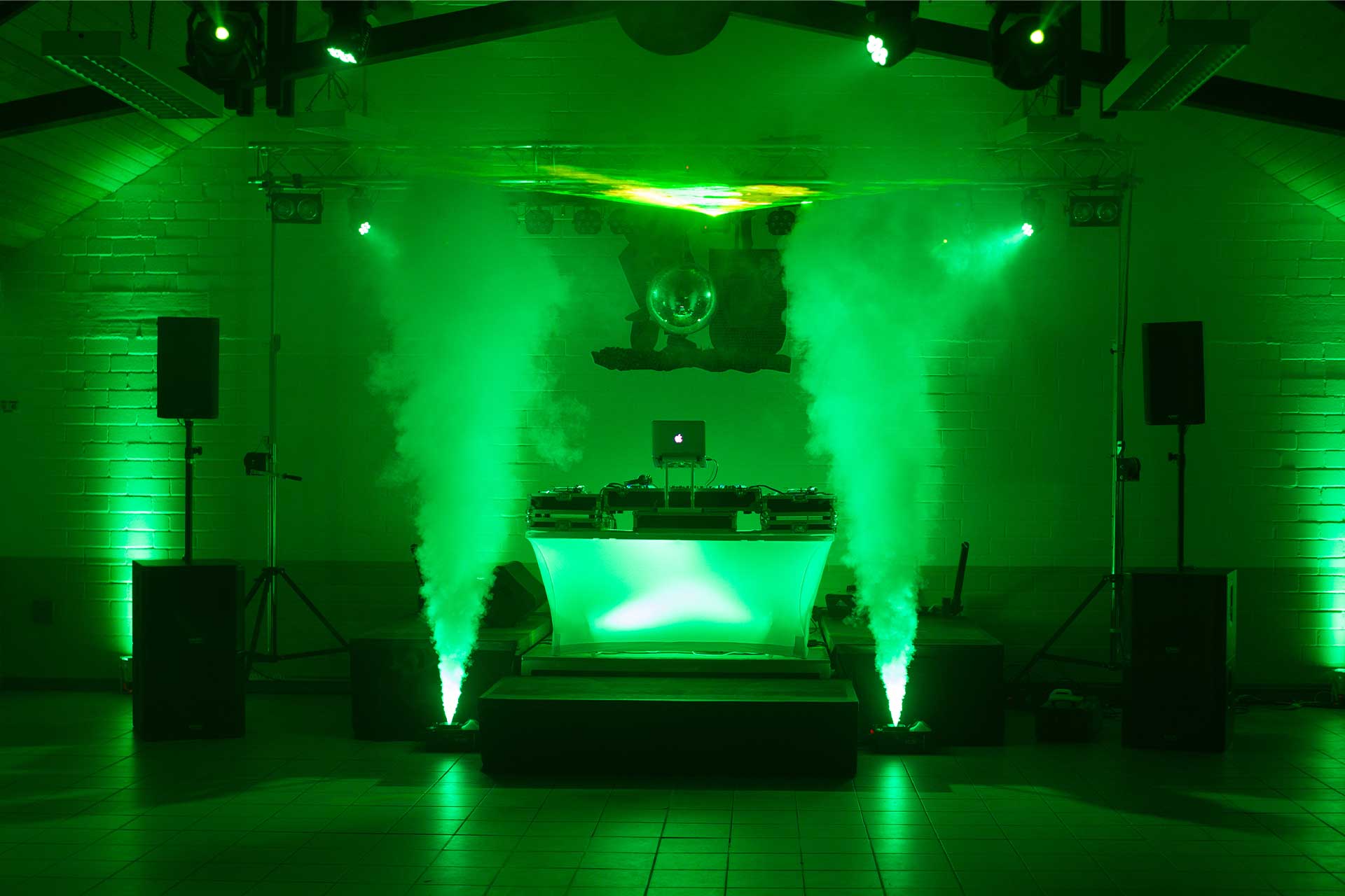 Überdies können Sie auch einen sogenannten Hazer buchen, der im Gegensatz zu einer Nebelmaschine einen kontinuierlichen Nebel produziert, der viel feiner ist als der Nebel einer Nebelmaschine. Durch den dauerhaften Ausstoß entsteht jedoch kein „Highlight“ in Form eines kurzzeitigen starken Nebels. Gerne beraten wir Sie, welche Art für Ihre Party am besten geeignet ist.